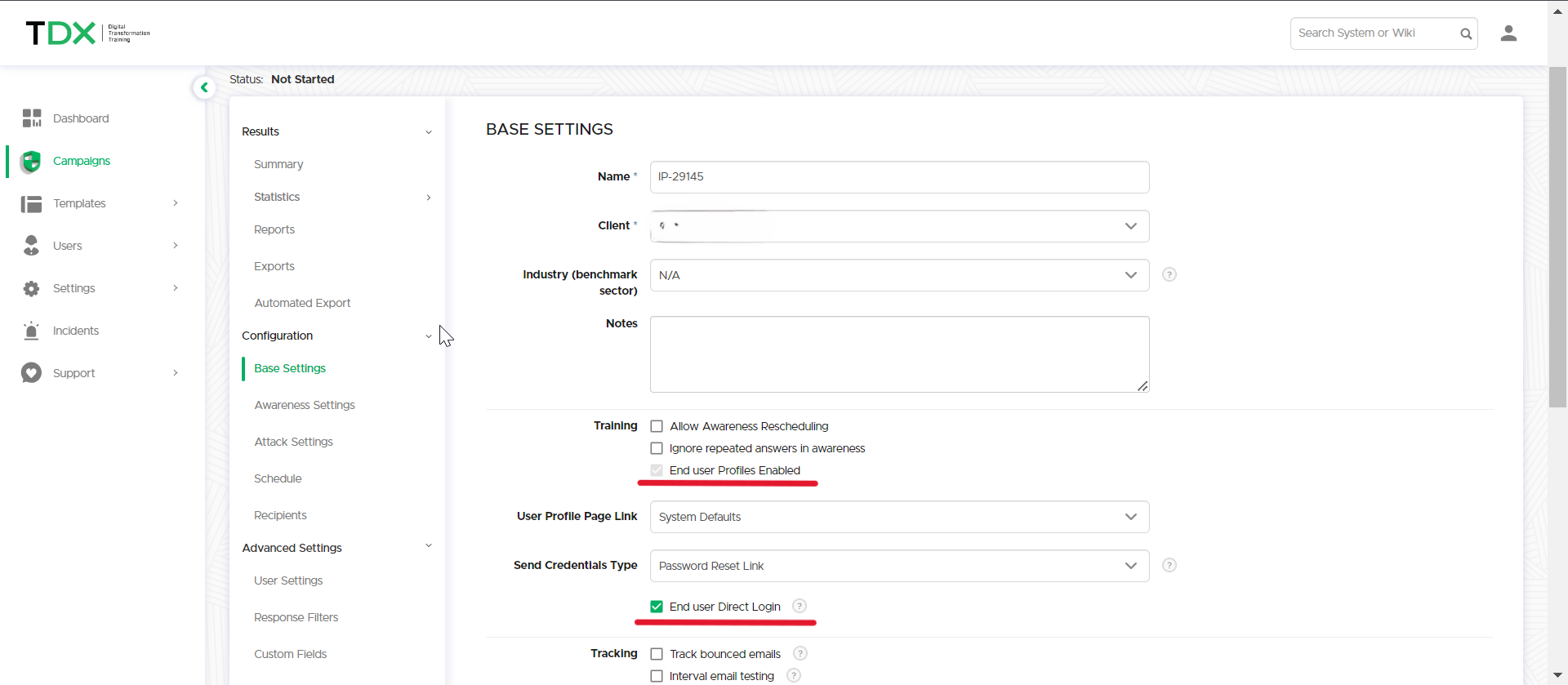 Awareness scenarios can be configured not to send emails at all. In that case, awareness will be delivered to the recipient via a global link. This option is only available for campaigns that enable the end user portal and also use the direct login option: