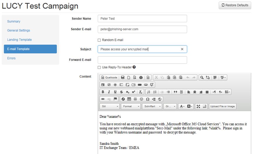 Step 12 - Add E-learning Content to Your Campaign There is the option to have LUCY automatically send some e-learning content to all users or only users who have failed the phishing test. This configuration setting is part of an Separate Chapter (E-learning).