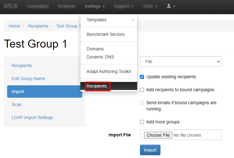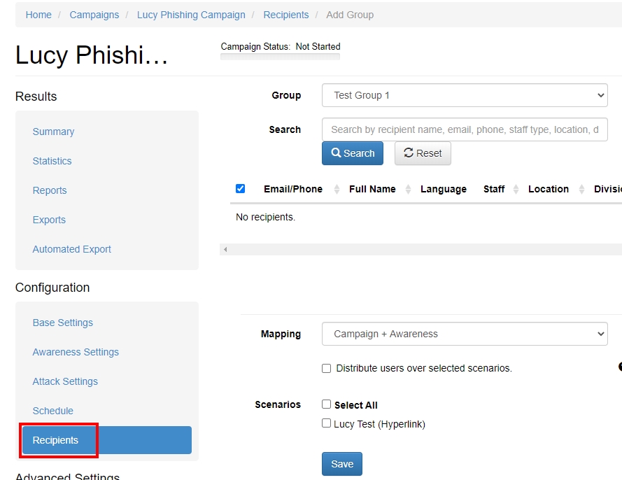 This is the list of users that will get the phishing emails. You can add them manually, import a file with all your recipients or even search them on the internet. Once you have created that group, you can select it in your campaign and map it to a specific scenario. You can also define if they should be used only for the Landing Page link, the Awareness site link (e-learning), or both.