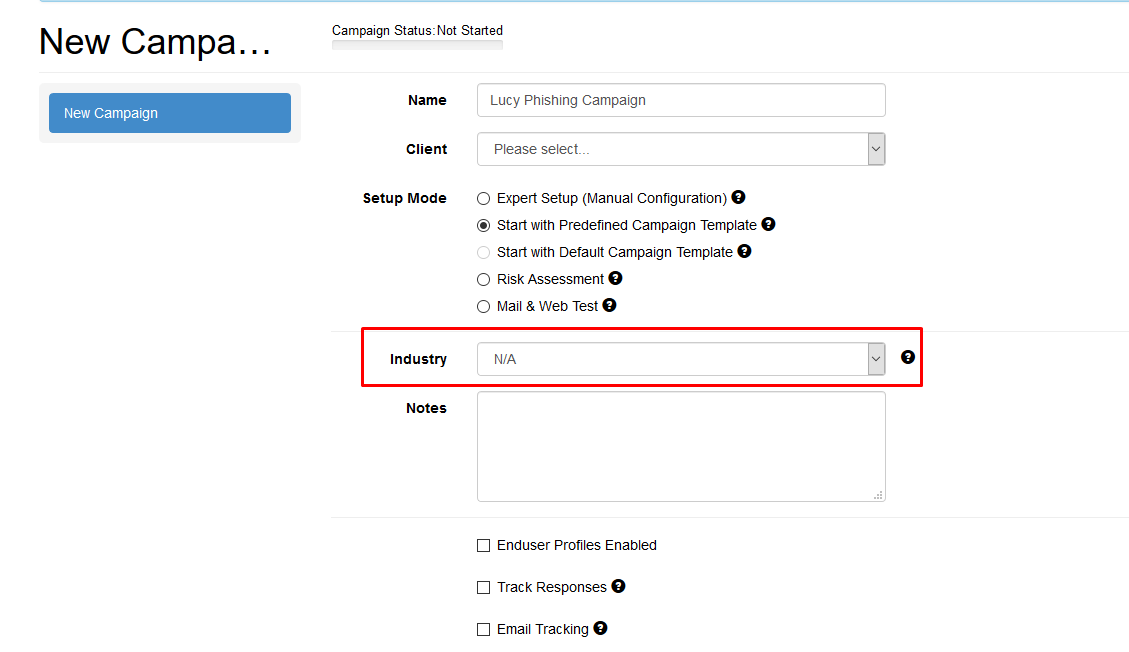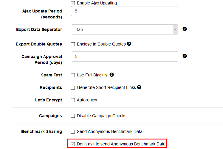 You can set a Benchmark for a campaign (when you start a campaign). The Benchmark will allow you to compare results from different campaigns and sectors with each other (in case you use LUCY for performing phishing campaigns against multiple clients). The benchmark uses an internal database and no data every gets submitted to our server. Only if you use LUCY for the very first time, you will get asked once, if you want to participate in submitting anonymous data. The default value is no submission of anonymous data. Your answer will get stored within the advanced settings: